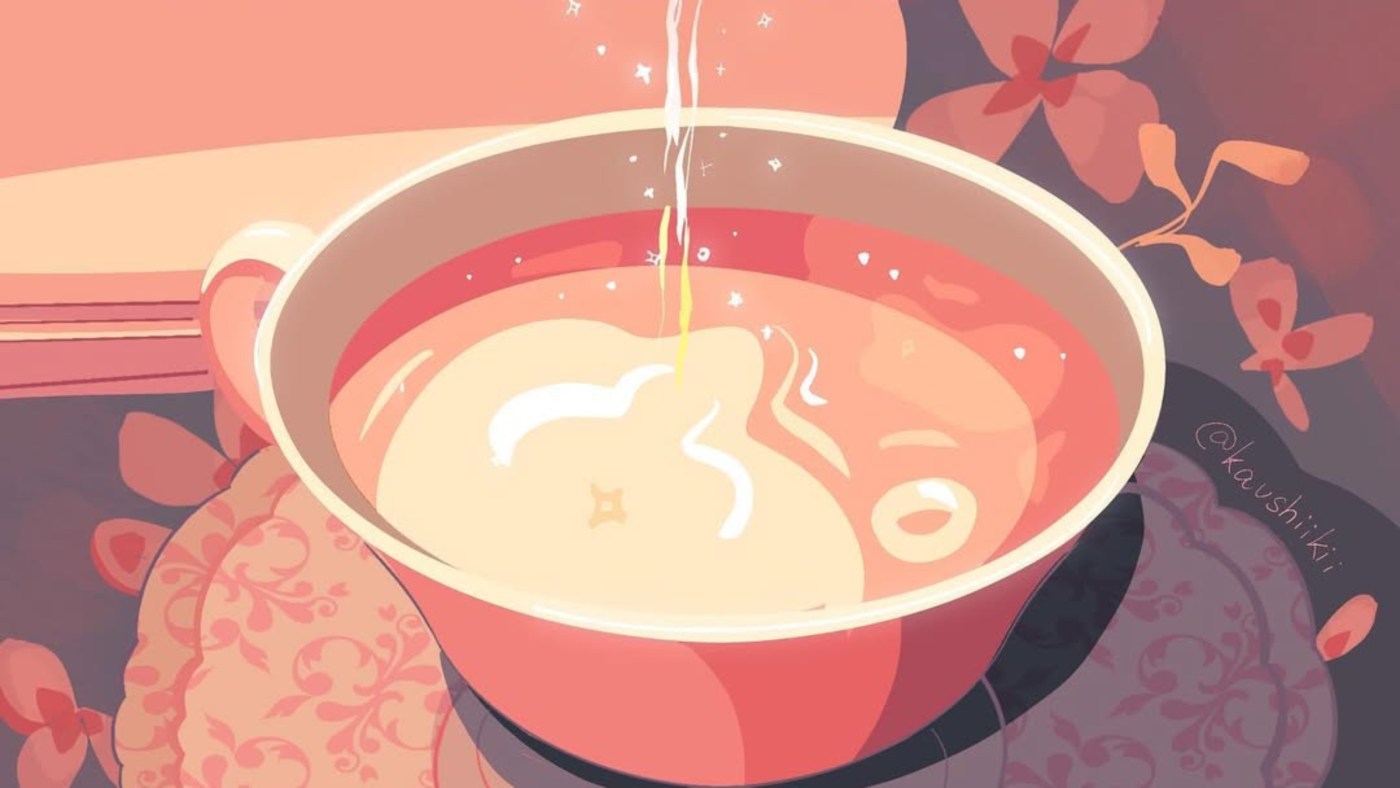 A painting of tea, hot and steaming.